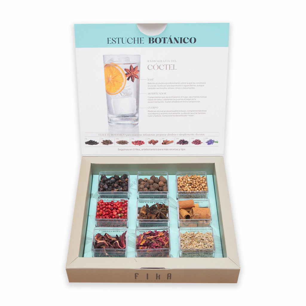 1 Estuche Botánico con 9 Especias (Cont. Neto 102g: Bayas de Enebro, Pimienta de Jamaica, Coriandro, Pimienta Rosa, Anís Estrellado, Canela, Flor de Hibiscus, Rosas Persas, Lavanda).